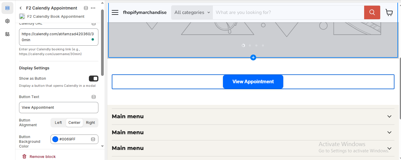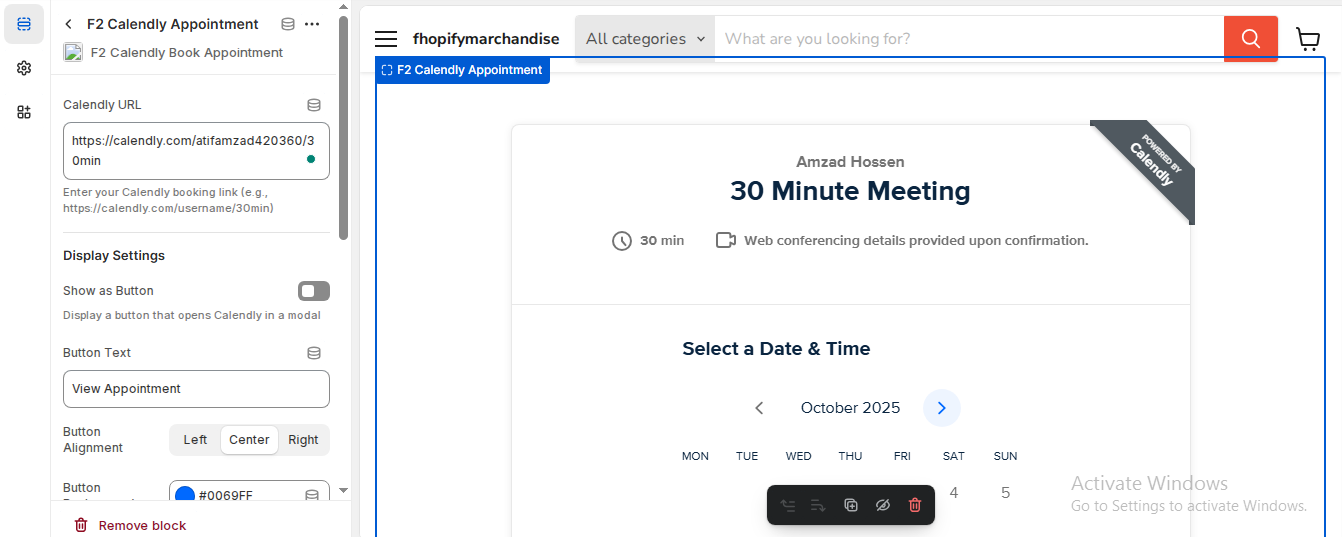 F2 Calendly Book Appointment embeds your Calendly booking page directly in your Shopify store. Paste your Calendly URL to display the appointment form inline, or switch to a sleek button that opens the form in a modal. Control iFrame height separately for mobile and desktop—no scroll bars, always a perfect fit. Customize button text, alignment, and color. No code required; Online Store 2.0 block, fast and responsive. Use on any page so customers book without leaving your site.