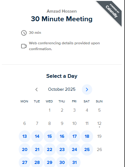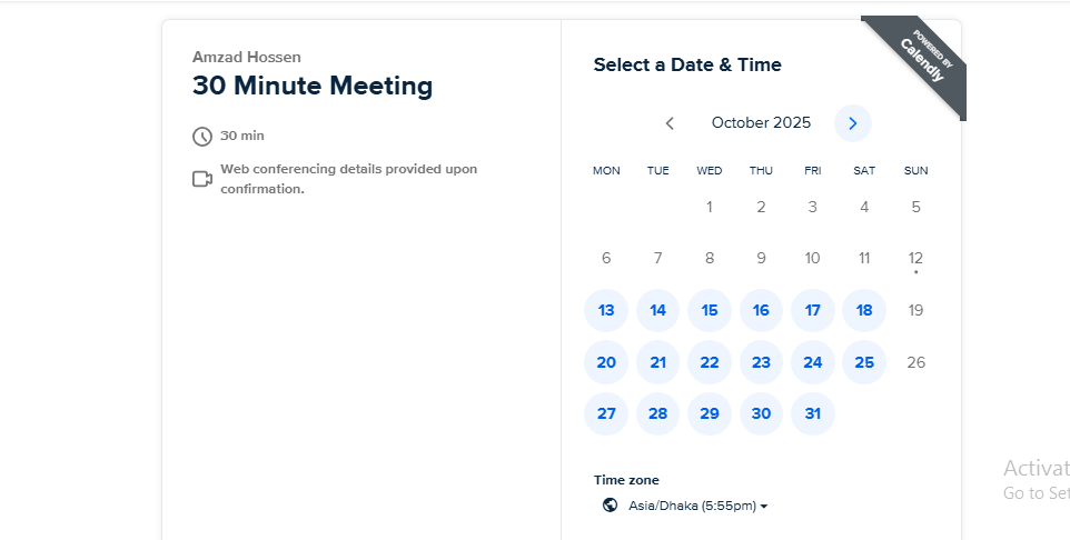 ⦁ A public Calendly booking link (e.g., https://calendly.com/username/30min).