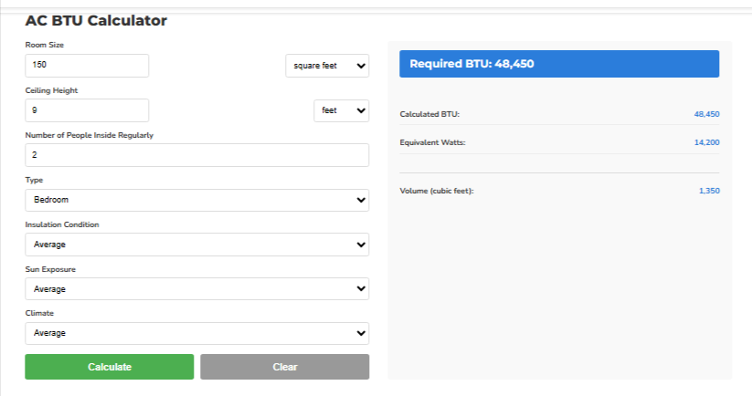 The tool calculates the recommended BTU capacity required for efficient cooling.