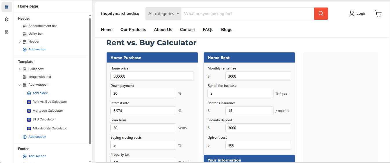 Inside the theme editor you can add calculator blocks anywhere on your store.